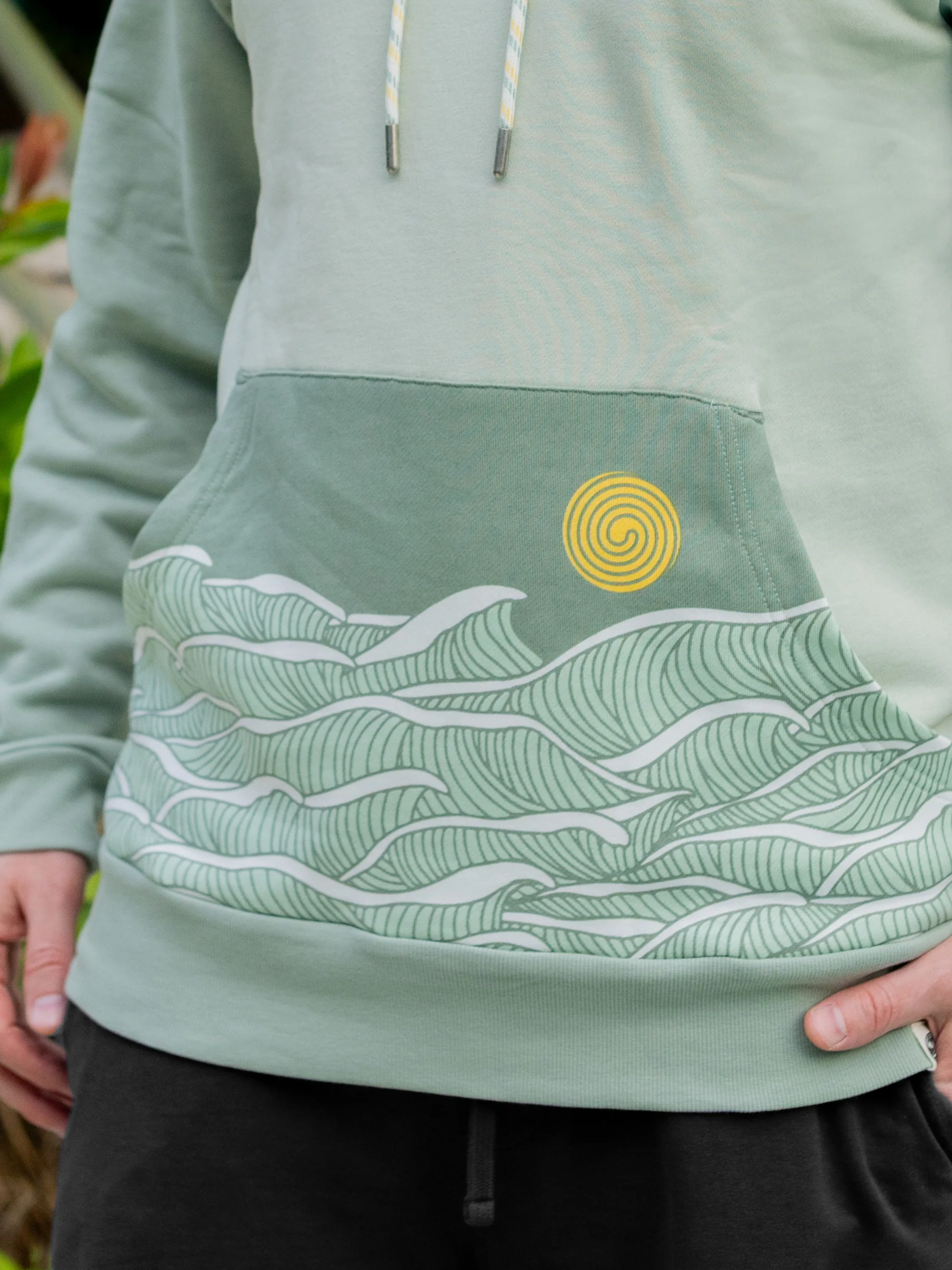 Relaxed hoodie with oversized hood (fits over headphones!) and large, decorative front pocket. Made Fair Trade from premium organic cotton. This two-toned hoodie in Ocean Mist and Seafoam is embroidered on the left shoulder and printed seam-to-seam on the kangaroo pocket with non-toxic, water-based inks.