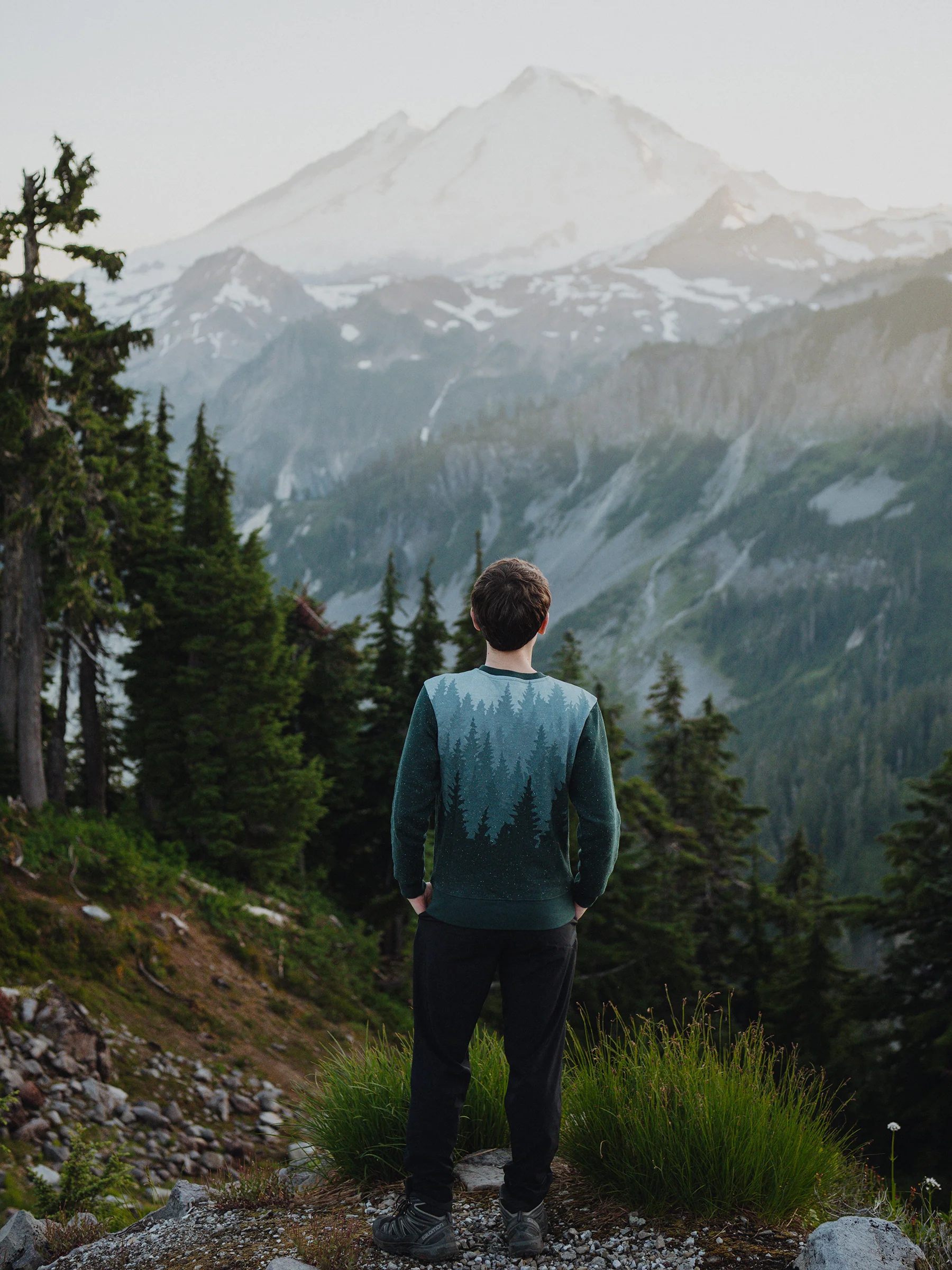A forest of firs fades into the mist on the front and back of this pullover.