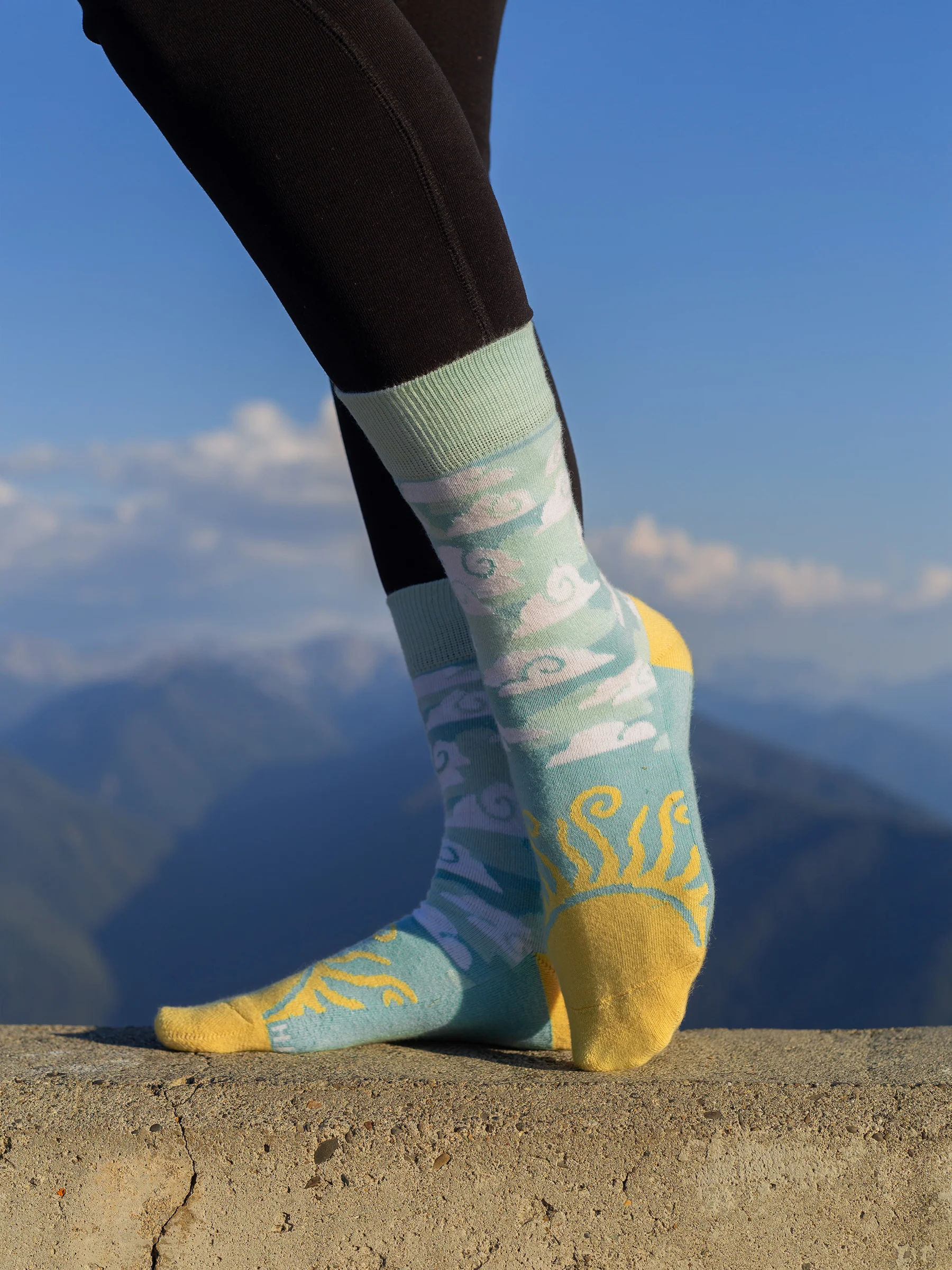 Made for treading brightly. Blue skies, fluffy clouds, and a warm sun helps these socks really shine.